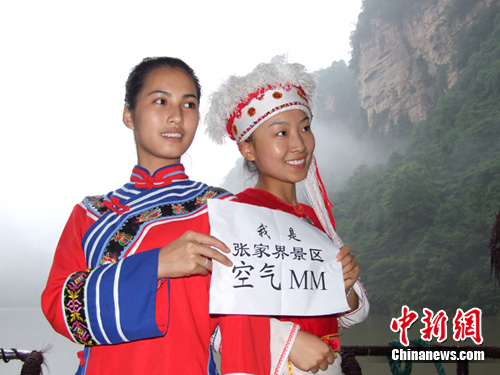張家界國(guó)家森林公園空氣中負(fù)氧離子的含量達(dá)每立方厘米10萬個(gè),是個(gè)名副其實(shí)的天然氧吧。為了吸引更多游客來張家界呼吸清新的空氣,兩位自稱“空氣妹妹”的少數(shù)民族女孩近日在張家界寶峰湖景區(qū)自發(fā)向中外游客推薦這一新特產(chǎn)——張家界空氣。周蘆屾 攝