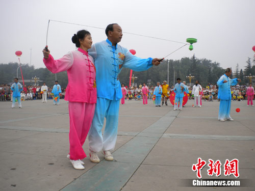 在保定人民廣場主會場,近千名空竹愛好者在空竹大師吳春鳴的帶領下,通過“群英薈萃”、“龍飛鳳舞”、“竹韻聲聲”、“激情飛揚”等表演,把空竹的盤、拋、接等技巧表現(xiàn)的淋漓盡致。場上巨型空竹、雙人空竹、輪滑空竹、頂竿空竹、呼啦圈空竹漫天飛舞,蔚為壯觀。