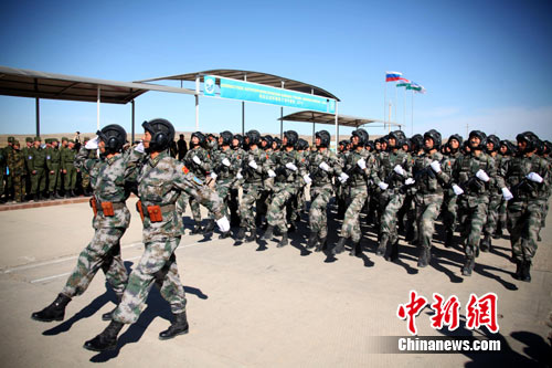 9月24日,“和平使命-2010”上海合作組織成員國武裝力量聯(lián)合反恐軍事演習(xí)戰(zhàn)役實施階段實兵演練,演練在哈薩克斯坦南部馬特布拉克訓(xùn)練場正式舉行。當天下午在野戰(zhàn)兵營為聯(lián)演中表現(xiàn)優(yōu)異的各方軍官和士兵代表舉行頒獎儀式,圖為中方參演部隊官兵分列式走過儀式主席臺。