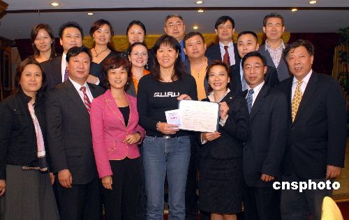 著名中國女排運(yùn)動(dòng)員,現(xiàn)任美國女排主教練郎平,十月二十日將赴新澤西州參加美國奧委會(huì)的一個(gè)頒獎(jiǎng)活動(dòng),十月十九日郎平取道紐約,受到此間北京鄉(xiāng)親和僑界的熱烈歡迎。紐約州眾議員楊愛倫(前右三)向郎平(前左四)頒發(fā)感謝狀,表彰她為中美兩國女排作出的貢獻(xiàn),并向郎平贈(zèng)送了她選區(qū)(發(fā)拉盛)的“護(hù)照”。前左三為紐約北京同鄉(xiāng)會(huì)會(huì)長侯建利。中新社發(fā) 龔文謨 攝