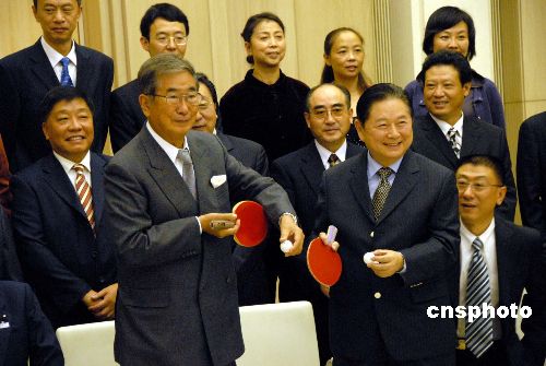 10月26日下午,東京都知事石原慎太郎在東京市政大廈會見正在日本訪問的中國乒協(xié)主席徐寅生及其訪日團一行20人。徐寅生一行應(yīng)日本乒協(xié)的邀請10月25日抵達東京開始對日本進行一周訪問,代表團成員包括莊則棟、曹燕華等10多名國手。石原慎太郎說,在日中邦交正;35周年之際,在東京見到中國的著名乒乓選手非常榮幸。石原希望中國支持東京申辦2016年夏季奧運會,通過體育交流促進中日關(guān)系。中新社發(fā) 段躍中 攝