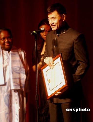 中美電影節(jié)十一月一日晚在好萊塢美國(guó)導(dǎo)演公會(huì)開幕,聯(lián)合國(guó)兒童機(jī)構(gòu)一個(gè)協(xié)會(huì)特意向中國(guó)影星于榮光頒發(fā)和平發(fā)展親善大使證書。中新社發(fā) 賈國(guó)榮 攝