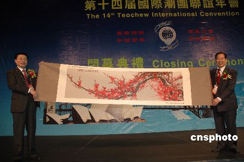 當?shù)貢r間十一月四日,中國國務(wù)院僑務(wù)辦公室副主任馬儒沛(左)代表國僑辦向第十四屆國際潮團聯(lián)誼年會贈送紀念品。中新社發(fā) 葛明 攝