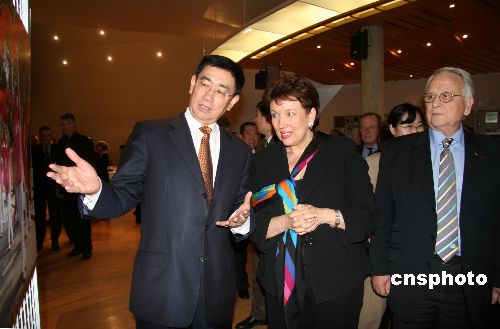 11月7日晚,由中國駐法使館和法國奧委會共同主辦的“北京歡迎您”迎奧運(yùn)圖片展,在巴黎法國奧委會總部、法蘭西運(yùn)動之家隆重開幕。旅法華人社團(tuán)僑領(lǐng)等各界人士約400人出席了開幕儀式。圖為中國駐法大使趙進(jìn)軍和法國衛(wèi)生、青年與體育部長巴舍洛-納爾坎女士,法國奧委會主席塞朗杜爾參觀圖片展。中新社發(fā) 鐘誠 攝