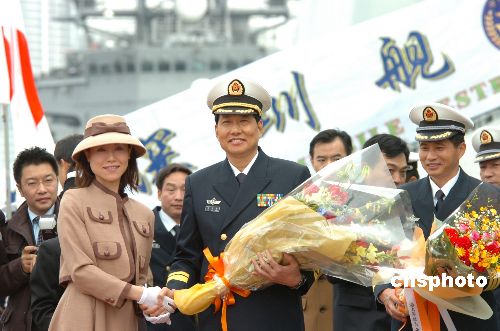 圖為日本禮儀小姐向南海艦隊(duì)副司令員肖新年少將獻(xiàn)花。