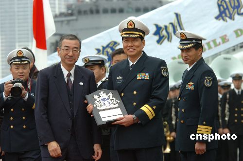 圖為日本東京都代表向訪日艦隊(duì)指揮官、南海艦隊(duì)副司令肖新年少將贈送紀(jì)念品。