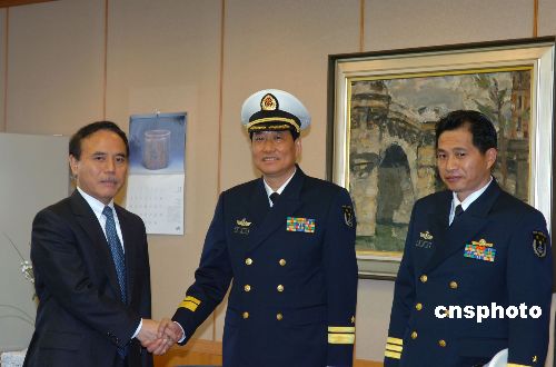 11月29日上午,正在日本進(jìn)行正式友好訪問的中國海軍軍艦訪日團指揮員肖新年少將一行來到日本防務(wù)省,與日本軍界進(jìn)行交流活動。圖為肖新年少將(中)與日本防務(wù)省遷優(yōu)參事官(左)握手,訪日中國海軍導(dǎo)彈驅(qū)逐艦“深圳號”艦長朱建達(dá)上校(右)陪同會見。中新社發(fā) 滕劍峰 攝