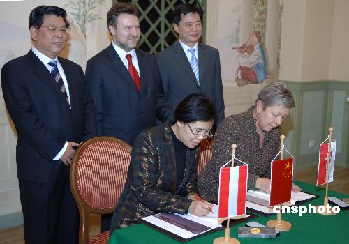 11月30日,維也納中國(guó)文化中心項(xiàng)目的簽字儀式在維也納市政廳舉行。中國(guó)文聯(lián)書(shū)記胡振民(后排左一)、中國(guó)駐奧地利大使吳懇(后排右一)出席簽字儀式。圖為奧中文化交流促進(jìn)會(huì)會(huì)長(zhǎng)金鈴和維也納市政府代表(前右)在合作協(xié)議書(shū)上簽字。中新社發(fā) 鐘誠(chéng) 攝