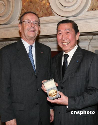 當(dāng)?shù)貢r(shí)間1月7日,法國(guó)納伊市市長(zhǎng)巴依向旅法僑界知名華裔人士何;(右)頒授榮譽(yù)獎(jiǎng)?wù)拢员碚盟麨榇龠M(jìn)法中友好與合作及亞裔融入法國(guó)社會(huì)做出的積極貢獻(xiàn)。與法國(guó)總統(tǒng)薩科奇相識(shí)三十多年的何;,是該市的一位知名人士,2007年底薩科奇首次訪(fǎng)華時(shí),何;鳛榇韴F(tuán)中唯一的華裔人士隨同訪(fǎng)問(wèn)。中新社發(fā) 鐘誠(chéng) 攝