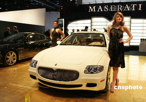 底特律當(dāng)?shù)貢r間一月十三日,在2008年北美國際汽車展上,瑪莎拉蒂豪華房車與時尚美女華麗現(xiàn)身。中新社發(fā) 潘索菲 攝