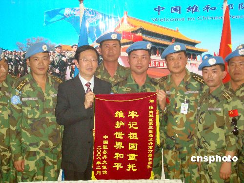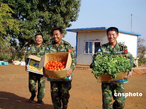 當?shù)貢r間2月3日下午,中國駐蘇丹大使李成文在董建東武官的陪同下,帶領(lǐng)中國石油天然氣集團公司代表一行5人乘專機前往蘇丹南部城市瓦烏,慰問中國駐蘇丹維和工兵、運輸、醫(yī)療分隊。李大使代表中國駐蘇丹大使館向維和部隊贈送一面鑲有“牢記祖國重托、維護世界和平”字樣的錦旗及慰問品。隨同的中國石油天然氣集團公司代表向維和部隊贈送1000余公斤新鮮蔬菜。中新社發(fā) 劉恩海 攝