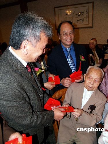 圖為中華會(huì)館主席伍競?cè)旱葍S領(lǐng)特向101歲的老人周榮福發(fā)紅包。