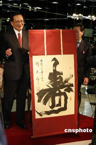 中國國務(wù)委員唐家璇2月20日下午抵達(dá)日本后即趕往日本松山芭蕾舞團(tuán),拜訪為中日友好曾作出過突出貢獻(xiàn)的該團(tuán)創(chuàng)始人清水正夫和松山樹子夫婦、及該團(tuán)現(xiàn)任總代表清水哲太郎、團(tuán)長森下洋子等。圖為唐家璇在松山芭蕾舞團(tuán)獲贈(zèng)大幅“壽“字書法作品。中新社發(fā) 朱沿華 攝