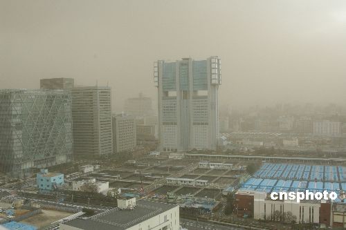 2月23日午后,東京出現(xiàn)大風(fēng)天氣,瞬間風(fēng)力達到15.9公里,一時間,黃沙漫天。圖為東京都港區(qū)的高層建筑群浸潤在黃色沙塵中。中新社發(fā) 滕劍峰 攝