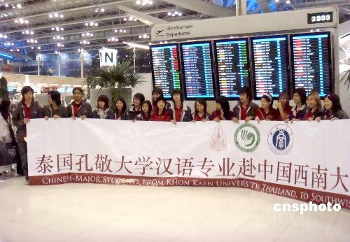 來自泰國孔敬大學(xué)孔子學(xué)院的五十七名泰籍本科生帶著家長與老師的諄諄教誨五日飛往重慶中國西南大學(xué),開始他們在中國為期兩年的學(xué)習(xí)生活,這標(biāo)志著泰國孔敬大學(xué)孔子學(xué)院與中國西南大學(xué)的“一加二加一漢語本科”合作項目正式啟動?拙创髮W(xué)孔子學(xué)院院長黃小明說,今天飛抵重慶的學(xué)生是兩校合作項目“一加二加一漢語本科”招收的第一批學(xué)生,本意是第一、第四年在泰國,第二、第三年在中國學(xué)習(xí),畢業(yè)時學(xué)生們將得到中泰兩校頒發(fā)的畢業(yè)證書。中新社發(fā) 顧時宏 攝