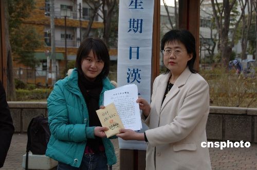 3月9日,日本東京漢語角舉行的第30次交流會上,日本僑報社社長張景子(右)代表中日兩國的捐款者,把全部捐款和寫給湖南省長周強的信,轉(zhuǎn)交給了正在日本訪問的湖南省人民對外友好協(xié)會干部曾卓然(左),表達大家對湖南災區(qū)人民的關(guān)切之情。近一個月來,日本僑報社組織的為湖南災區(qū)人民捐款活動,共收到4個團體、53位日本友人和在日華人的全部捐款38.2885萬日元。中新社發(fā) 段躍中 攝