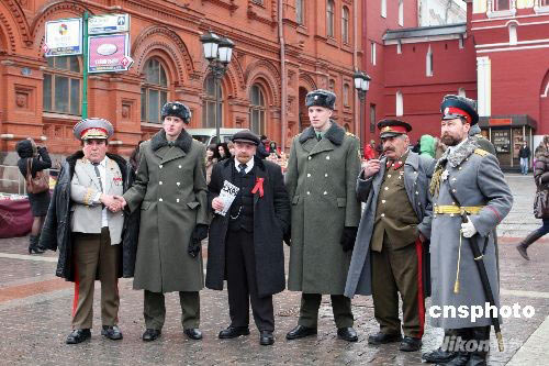今年4月22日是列寧誕辰138周年紀(jì)念日,俄羅斯各地民眾向列寧紀(jì)念碑等敬獻(xiàn)花圈,并舉行各種紀(jì)念活動(dòng)。圖為紅場入口處的列寧、斯大林、沙皇的扮演者們,與俄羅斯士兵合影。中新社發(fā) 田冰 攝