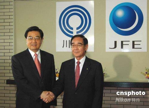 5月9日上午10時(shí)20分,正在日本進(jìn)行國事訪問的中國國家主席胡錦濤來到神奈川縣川崎市的日本JFE工程技術(shù)株式會(huì)社下屬川崎環(huán)保工廠參觀,受到該廠員工們熱烈歡迎。圖為胡錦濤主席與前來迎接的川崎市市長阿部孝夫(右)握手留影。中新社發(fā) 關(guān)妍 攝