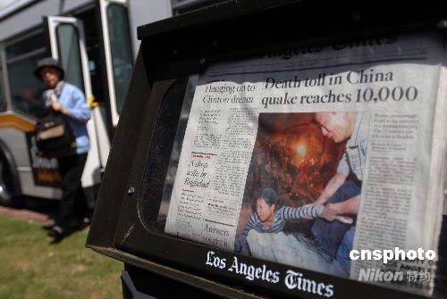 當(dāng)?shù)貢r(shí)間五月十三日,美國(guó)洛杉磯地區(qū)的主流媒體和主要中文媒體均在頭版頭條和內(nèi)頁(yè)突出報(bào)道四川汶川大地震。圖為當(dāng)天出版的美國(guó)主流媒體《洛杉磯時(shí)報(bào)》在頭版突出報(bào)道汶川大地震。中新社發(fā) 張煒 攝