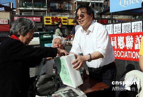 5月13日下午,在紐約第二大華埠——法拉盛,紐約華人社團(tuán)聯(lián)席會(huì)及屬下四川同鄉(xiāng)聯(lián)誼會(huì)在街頭募集捐款,援助四川地震災(zāi)區(qū),很多過往行人紛紛捐款。中新社發(fā) 譚宏偉 攝