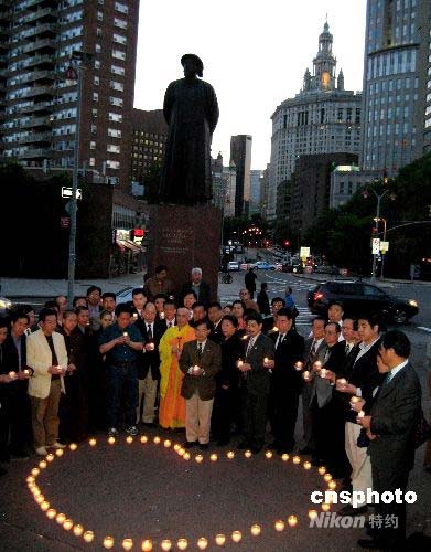 美東華人社團聯(lián)合總會于十三日晚八點在紐約曼哈頓中國城的林則徐廣場發(fā)起了美東華人燭光祭奠中國地震災區(qū)死難同胞的紀念活動,華聯(lián)總會下屬的多個僑團都派代表出席,大家共同祈禱祝福幸存的災區(qū)同胞平安度過難關。圖為活動現場。中新社發(fā) 鄧悅 攝