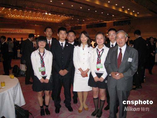 5月14日晚,由日本財團法人日中友好會館、社團法人日中友好協(xié)會主辦的歡迎中國高中生400人訪問團酒會在東京舉行。作為2008年“二十一世紀(jì)東亞青少年大交流計劃”的第二批,他們將參加與日中關(guān)系相關(guān)的研討會,走進(jìn)日本高中課堂,在日本高中學(xué)生家庭住宿外,還將進(jìn)行文化、經(jīng)濟、社會等方面的考察。圖為出席酒會的四川高中生和日中友好會館谷野作太郎副會長合影。中新社發(fā) 段躍中 攝