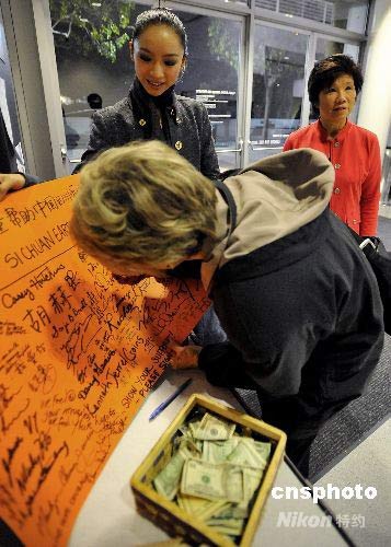 當(dāng)?shù)貢r(shí)間五月二十二日晚間,第五屆舊金山國(guó)際藝術(shù)節(jié)在舊金山芳草地藝術(shù)中心開(kāi)幕。原中央芭蕾舞首席演員侯宏瀾和美國(guó)舞者瓊斯擔(dān)綱的芭蕾舞劇《傾城之戀》作為首演節(jié)目登場(chǎng)。家在成都的侯宏瀾心系正在抗震救災(zāi)的家鄉(xiāng)父老,在劇場(chǎng)門口樹(shù)起一塊橙色紙板,用中英文寫(xiě)著“請(qǐng)幫助中國(guó)四川受災(zāi)的人們”。現(xiàn)場(chǎng)觀眾競(jìng)相簽名捐款。中新社發(fā) 陳鋼 攝