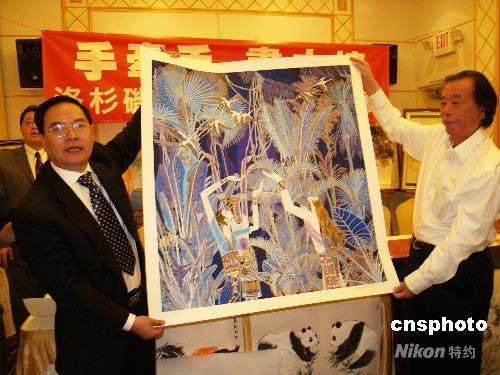 5月27日,著名旅美云南重彩畫家丁紹光捐出自己6幅畫作,參加洛杉磯66位畫家及書法家“手牽手、畫中情”共同為四川大地震捐畫賑災(zāi)義賣活動。當(dāng)天,丁紹光的5幅云南重彩畫即被高價拍賣,這次義賣所有款項(xiàng)將交中領(lǐng)館轉(zhuǎn)四川災(zāi)區(qū)。圖為丁紹光(右)展示義賣畫作,左為南加州華人團(tuán)體聯(lián)合總會會長程遠(yuǎn)。中新社發(fā) 盧威 攝