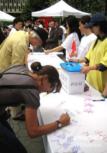 5月31日,由大紐約地區(qū)僑界、商界、學(xué)界共同發(fā)起的“手拉手,心連心,情系災(zāi)區(qū),賑災(zāi)助學(xué)”大型義演活動(dòng)在紐約曼哈頓舉行。本次活動(dòng)全部募捐所得款項(xiàng)都將轉(zhuǎn)交中國(guó)駐紐約總領(lǐng)事館,用于幫助四川災(zāi)區(qū)兒童盡快重返校園。圖為觀(guān)看義演活動(dòng)的外國(guó)友人捐款后在“災(zāi)無(wú)情、人有情”的橫幅上簽名,祝福中國(guó)災(zāi)區(qū)人民早日重建家園。中新社發(fā) 鄧悅 攝