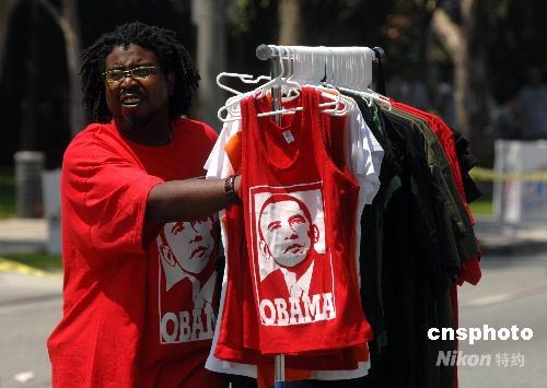 洛杉磯一名非裔小販在街頭兜售印有奧巴馬頭像的背心和T恤衫。目前,奧巴馬已穩(wěn)獲美國民主黨總統(tǒng)候選人提名,他得到了美國大多數(shù)非裔選民的強(qiáng)力支持。中新社發(fā) 張煒 攝