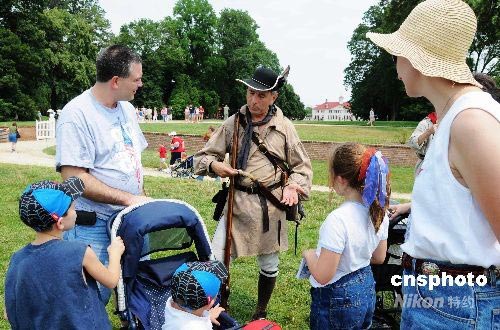 在美國開國總統(tǒng)喬治華盛頓的故居弗吉尼亞州芒特弗農(nóng),7月4日舉行了多種活動(dòng)紀(jì)念美國國慶,許多人裝扮成二百多年前獨(dú)立戰(zhàn)爭(zhēng)時(shí)期的士兵,和游人合影,并且還舉行了鳴槍儀式。圖為華盛頓故居弗吉尼亞州芒特弗農(nóng)山莊的一個(gè)古裝士兵在展演手中的武器。中新社發(fā) 邱江波 攝