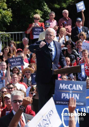 美國共和黨總統(tǒng)、副總統(tǒng)候選人約翰·麥凱恩和薩拉·佩林10日現(xiàn)身大華盛頓地區(qū)的弗吉尼亞州菲爾法克斯郡為競選造勢,支持者高呼“麥凱恩--合眾國”的口號,手舉麥凱恩、佩林的標(biāo)語牌。中新社發(fā) 邱江波 攝