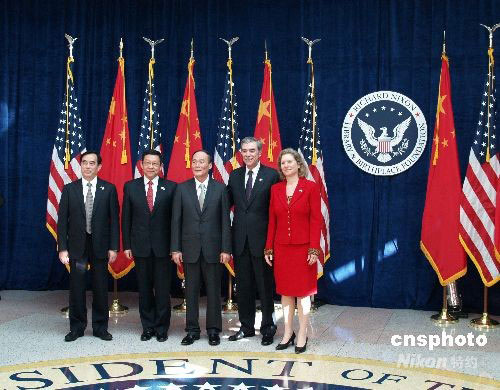 當(dāng)?shù)貢r(shí)間9月16日,中美商貿(mào)聯(lián)合委員會(huì)第19次會(huì)議在美國加利福尼亞州尼克松圖書館舉行,美國商務(wù)部長古鐵雷斯(左4)和貿(mào)易代表施瓦布(左5)在迎賓廳歡迎中國國務(wù)院副總理王岐山(左3)、中國商務(wù)部長陳德銘(左2)、中國海關(guān)總署署長盛光祖(左1)。中新社發(fā) 盧威 攝
