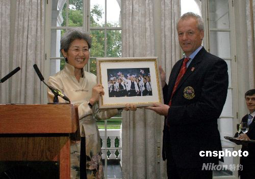 當?shù)貢r間17日晚,中國駐英使館在倫敦文華東方酒店舉辦招待會,慶祝北京奧運會和殘奧會的閉幕。圖為中國駐英大使傅瑩(左)向英國奧委會首席執(zhí)行官西蒙·克萊格贈送英國隊進入鳥巢體育場時的照片。 中新社發(fā) 李鵬 攝