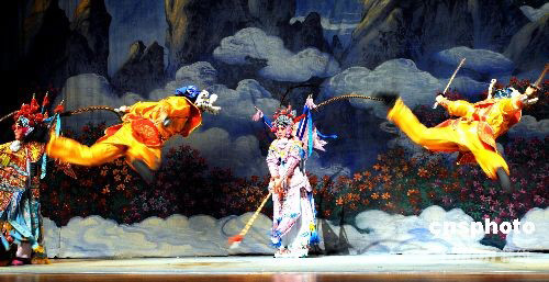 齊淑芳京劇團(tuán)在“世界舞臺(tái)系列”演出。今年是齊淑芳京劇團(tuán)在美國(guó)成立20周年,應(yīng)紐約大學(xué)SKIRBALL中心的邀請(qǐng),10月5日,該團(tuán)以《楊門(mén)女將》參加由十個(gè)國(guó)家輪流表演的“世界舞臺(tái)系列”中演出,為讓不懂漢語(yǔ)的觀眾看懂京劇《楊門(mén)女將》,齊淑芳京劇團(tuán)在百老匯演出的腳本上作了重大修改,減少唱段,增加武打,使文戲動(dòng)聽(tīng),武打精彩,劇情緊湊。中新社發(fā) 龔文謨 攝
