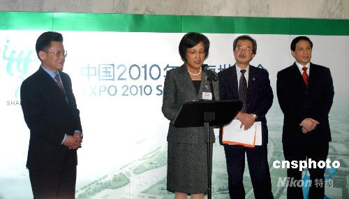 當地時間十月六日,“上海世博會聯合國圖片展”在紐約聯合國總部開幕。上海世博會執(zhí)委員常務副主任鐘燕群(中)介紹上海世博會籌備情況。聯合國副秘書長沙祖康(左)、副秘書長赤阪清隆(右二)和中國常駐聯合國代表張業(yè)遂出席開幕式(右)。該圖片展由上海世博會事務協調局、中國常駐聯合國代表團和上海市對外文化交流協會共同舉辦。中新社發(fā) 汪晨 攝