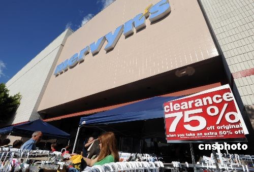 十月十八日,洛杉磯附近一家Mervyns百貨店打出削價百分之七十五清貨的告示,消費者正在選購清貨甩賣的服裝。擁有五十九年歷史的美國老牌連鎖百貨公司Mervyns剛剛成為美國經(jīng)濟滑坡的新犧牲品。這家已經(jīng)申請破產(chǎn)保護的百貨公司周五宣布,旗下一百四十九家商店進行清貨銷售,然后關(guān)門停業(yè)。美國金融危機已經(jīng)蔓延到實體經(jīng)濟,十月份美國消費信心指數(shù)創(chuàng)下三十年來最大月度跌幅。中新社發(fā) 張煒 攝