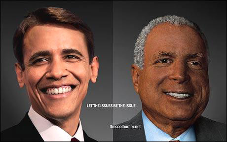 美國(guó)2008年總統(tǒng)大選即將到達(dá)高潮時(shí)刻,選民們即將投票選出他們心目中的新總統(tǒng)。日前,美國(guó)著名廣告公司——精信廣告公司制作了一款海報(bào),將奧巴馬和麥凱恩的膚色對(duì)調(diào):奧巴馬變成了白人,麥凱恩變成了黑人,希望以此呼吁選民忽略種族差異。