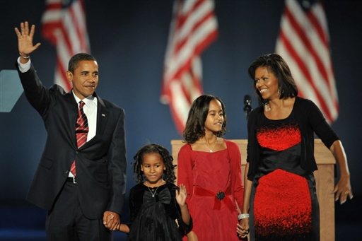 美國總統(tǒng)大選投票結(jié)果陸續(xù)出爐,奧巴馬篤定當(dāng)選下屆美國總統(tǒng)。他發(fā)表以“美國的變革”為主題的獲勝演說。圖為白宮新主人奧巴馬和家人向大家招手致意。