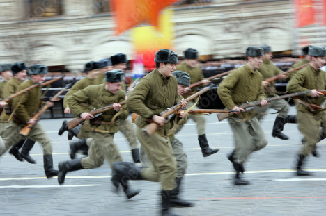 11月7日,俄羅斯士兵身著二戰(zhàn)時期樣式的軍裝在莫斯科紅場參加閱兵儀式,紀(jì)念1941年11月7日的紅場閱兵式舉行67周年。1941年11月7日,在德國法西斯軍隊(duì)兵臨莫斯科城下之際,蘇聯(lián)軍隊(duì)在紅場上舉行了閱兵式,紀(jì)念十月革命24周年。參加閱兵式的部隊(duì)在閱兵完畢后直接開赴前線同入侵的法西斯德軍作戰(zhàn)。