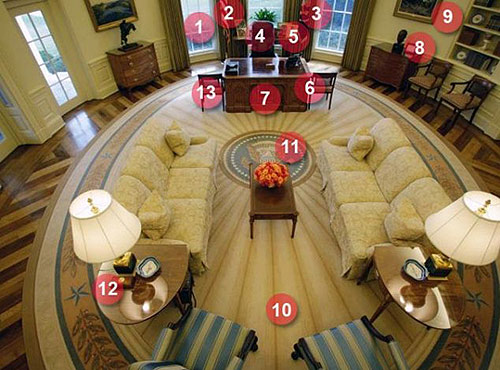 以下為奧巴馬入主宮橢圓形辦公室后,其內(nèi)部陳設(shè)猜想(號碼如圖):