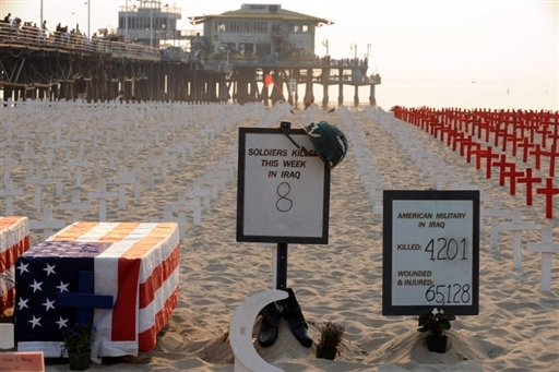 11月16日,美國加州,人們?yōu)橐翍?zhàn)中死難的美國士兵豎起的十字架。自2004年起的每個周日,幾乎都有新的十字架被豎起。