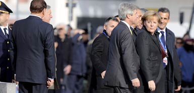 貝盧斯科尼撇開(kāi)歡迎委員會(huì)的工作人員,藏在一個(gè)街燈柱后面。當(dāng)?shù)聡?guó)總理默克爾走下專車,要進(jìn)入他們會(huì)面的地區(qū)委員會(huì)總部時(shí),他突然從街燈柱后面跳出來(lái),嘴里還喊著“咕咕”。據(jù)說(shuō)默克爾看起來(lái)很開(kāi)心,與貝盧斯科尼擁抱,并且親切地稱其“西爾維奧” 。