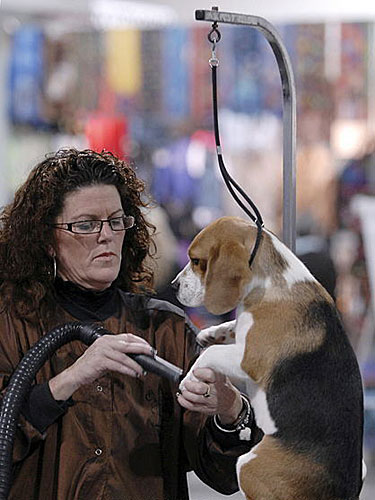 簡·科尼克正在給小獵犬“洛拉”打理前爪。