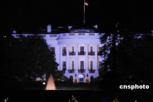 當(dāng)?shù)貢r(shí)間12月4日晚,美國華盛頓白宮南草坪萬人聚集,美國總統(tǒng)布什和夫人勞拉出席2008年“國家圣誕樹”點(diǎn)亮儀式。白宮南草坪的“國家圣誕樹”點(diǎn)亮儀式最早開始于1923年,白宮的主人都會(huì)在每年十二月第一周點(diǎn)亮這棵大型的圣誕樹和周圍栽種著象征美國五十個(gè)州小樹上的燈珠。圖為當(dāng)夜白宮在圣誕樹的映照下。中新社發(fā) 邱江波 攝