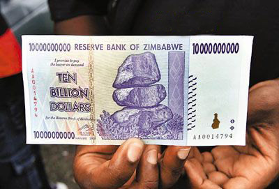 津巴布韋政局動蕩,經(jīng)濟惡化和嚴(yán)重通脹,央行前日起正式發(fā)行面額為10億、50億和100億的新鈔,創(chuàng)下世界之最。該國一周前才發(fā)行了面額1千萬、5千萬和1億的3種新鈔。