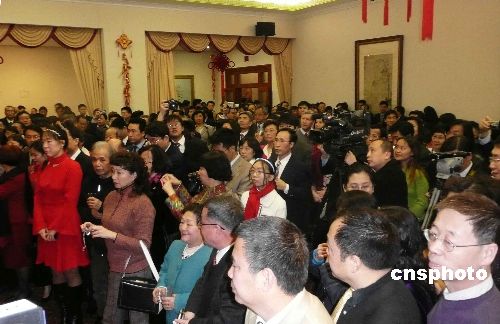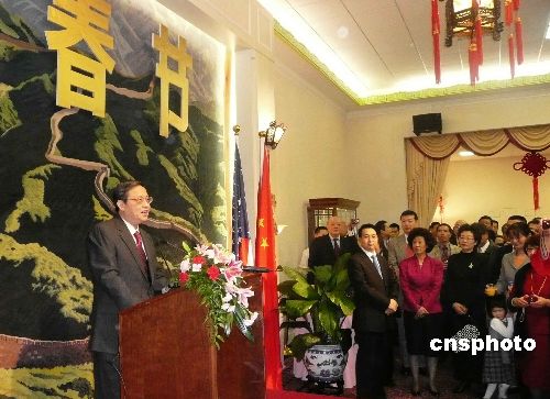 中國駐美大使周文重于當(dāng)?shù)貢r間17日晚在駐美使館華僑華人春節(jié)招待會上致辭時表示,展望處于復(fù)雜而深刻變化的二00九年,中美都面臨機遇和挑戰(zhàn),中方愿與美方一道推動中美關(guān)系穩(wěn)步發(fā)展。當(dāng)晚的招待會共有七百多名來自一百六十多個僑社的華僑華人出席。中新社發(fā) 覃展鵬 攝