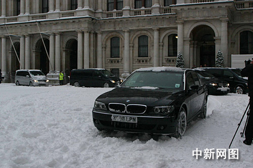當(dāng)?shù)貢r間二月二日上午八時三十分許,中國總理溫家寶在英國倫敦出席布朗首相舉行的歡迎儀式。圖為溫家寶的座車駛?cè)胗饨徊績?nèi)庭院歡迎儀式現(xiàn)場。前夜,倫敦突然迎來近十七年最大的一場降雪,整座城市被白雪覆蓋。中新社記者 張朔 攝