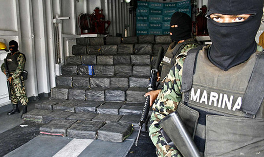 2月16日,在墨西哥的一處海軍基地,士兵正在看守繳獲的可卡因。15日,墨西哥海軍在太平洋國際海域的一艘船上繳獲近7噸可卡因,并扣押船上5名嫌疑人。
