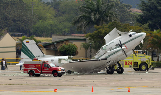 2月18日,哥倫比亞國(guó)家警察的一架DC-3飛機(jī)在麥德林的一個(gè)機(jī)場(chǎng)發(fā)生爆炸,造成至少8名警察受傷。圖為爆炸的飛機(jī)殘骸癱在停機(jī)坪上。